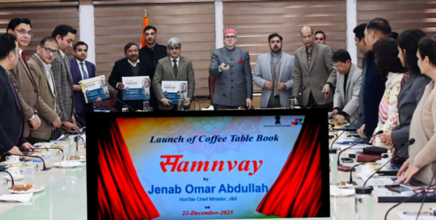 Jammu, Dec 22: Chief Minister Omar Abdullah on Monday released a coffee-table book titled ‘Samnvay’, which showcases the digital transformative journey of Jammu and Kashmir and documents the key projects and technological contributions of the Bhaskaracharya National Institute for Space Applications and Geo-informatics (BISAG-N) in J&K.