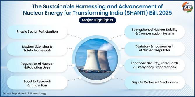 As India moves toward a more modern and future-ready nuclear energy structure, the Sustainable Harnessing and Advancement of Nuclear Energy for Transforming India (SHANTI) Bill, 2025, lays down a set of focused provisions to strengthen governance, safety, and institutional mechanisms. Its key objectives can be understood through the following major elements: