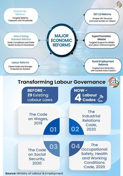 - Labour reforms unified 29 laws under four Labour Codes, extending social security and workplace safety.