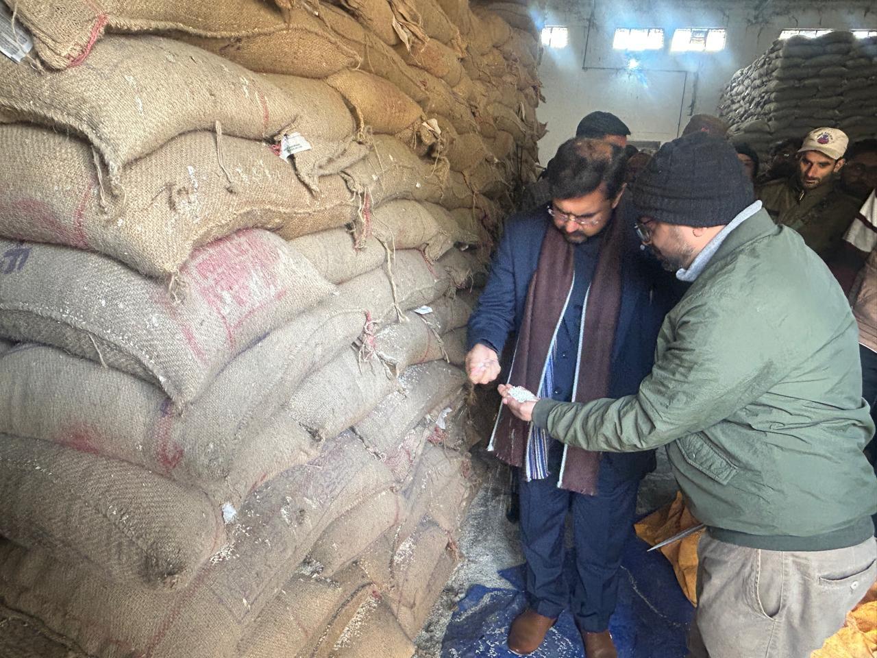 JAMMU, JANUARY 02: Minister for Food, Civil Supplies & Consumer Affairs (FCS&CA), Information Technology, Transport, Youth Services and Sports, ARI and Training, Satish Sharma, Friday conducted surprise inspection of the Food Corporation of India (FCI) godowns in Jammu to take first hand stock of the storage, quality and distribution mechanism of food grains meant for public consumption.