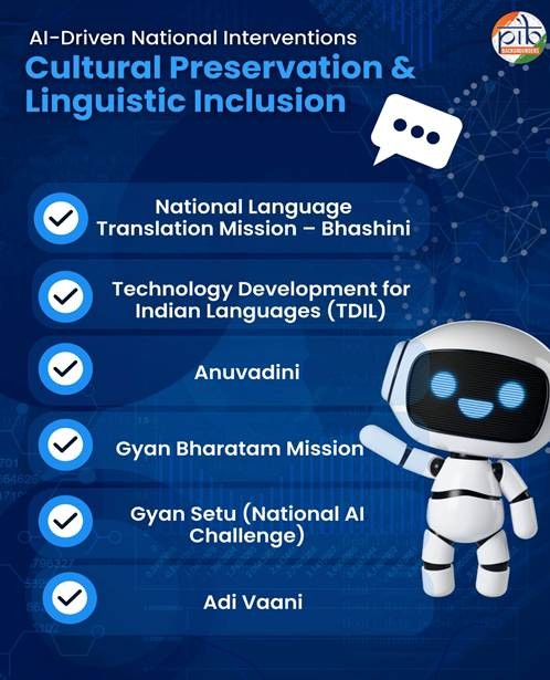 - India is institutionalising AI for culture and languages through national platforms such as BHASHINI, Anuvadini, Gyan Bharatam and Adi Vaani etc.