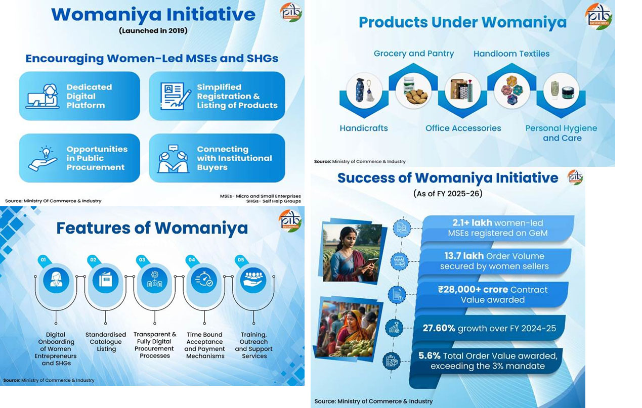 - The Womaniya initiative enables women entrepreneurs and SHGs to sell directly to Government buyers through the GeM platform.