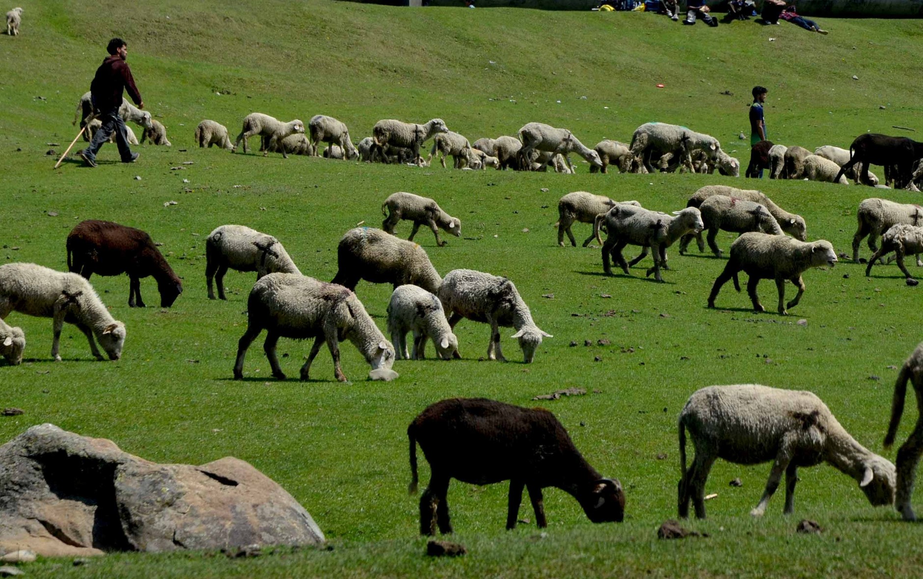 A herd of sheep grazing in the lush green meadows of central Kashmir’s Budgam district